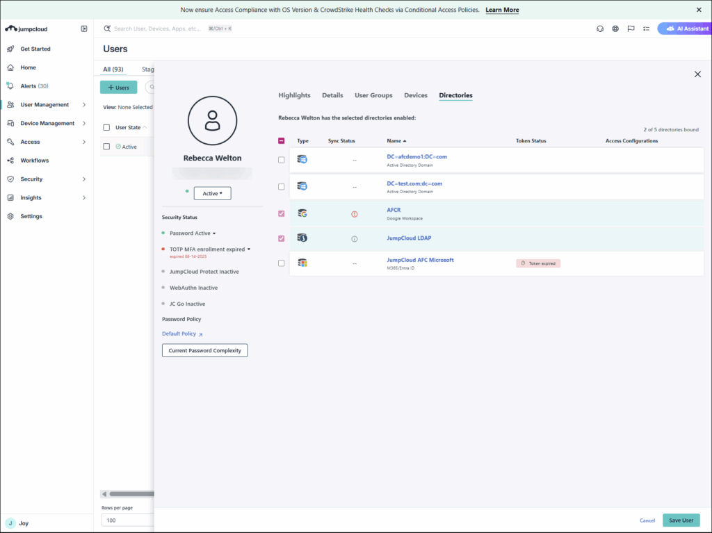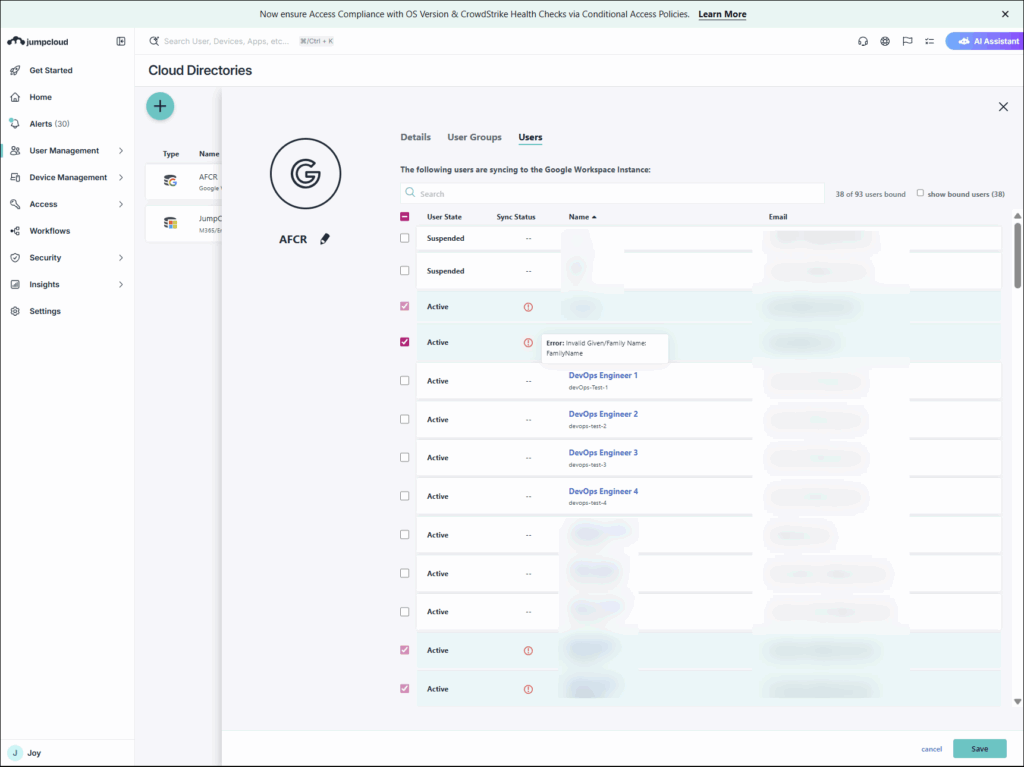 - A Google Workspace Cloud Directory integration authorized and active in JumpCloud