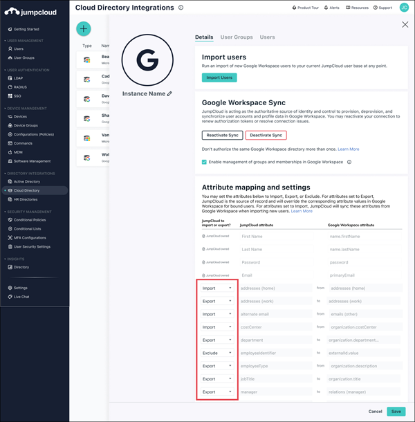 - Export - Attributes operate as they do today, being synced to Google from JumpCloud.