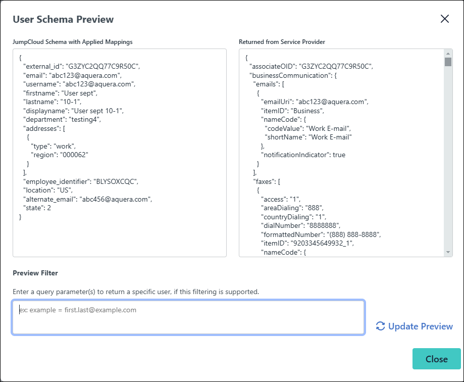 - The User Schema Preview window will show the translation for the first user.