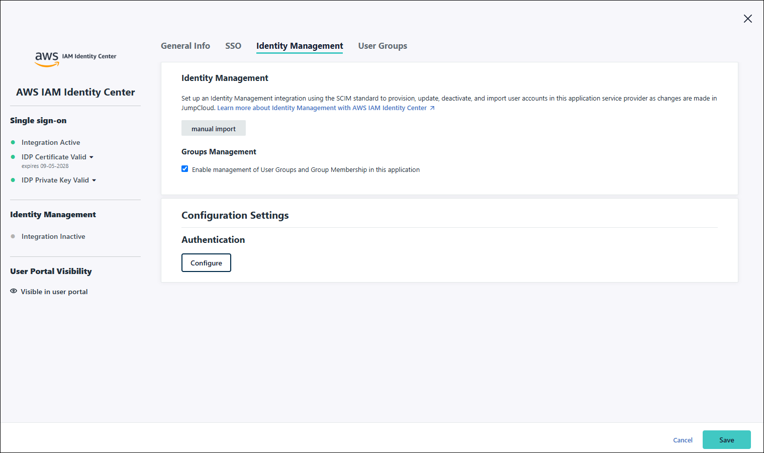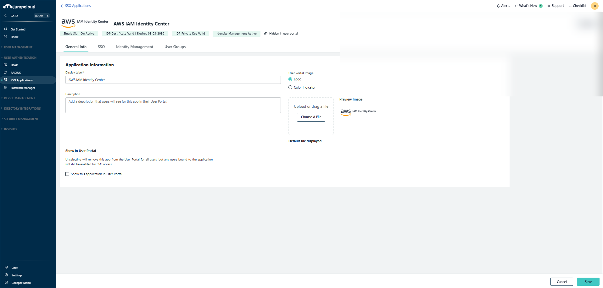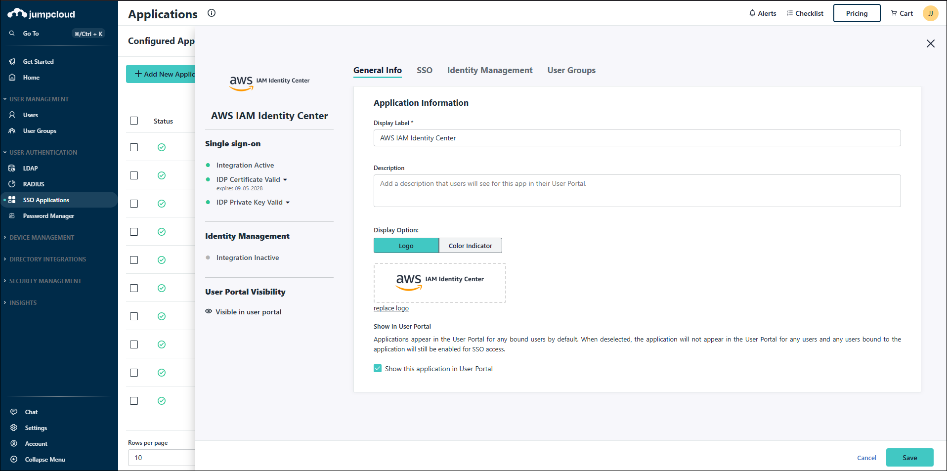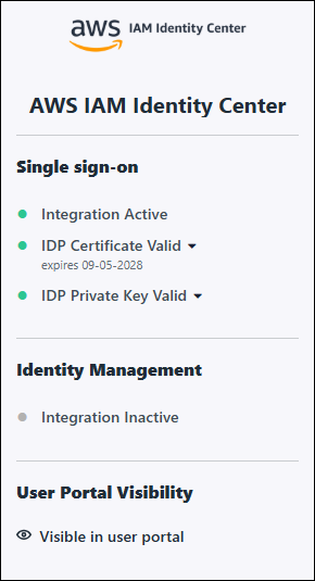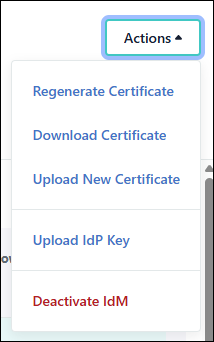 The status of your integration(s), certificate and IdP Key are now shown above the application configuration tabs. Certificate management, uploading the IdP key and deactivating IdM has been moved to the new Actions menu.