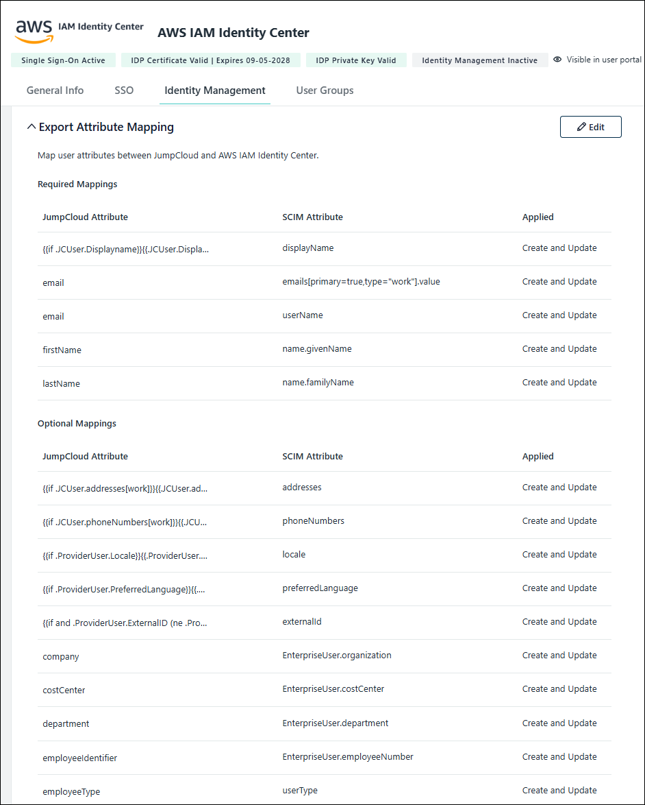 An Export Attribute Mapping table is available after creating your prebuilt SCIM application connector. This enhanced visibility offers increased transparency, granular control and improved troubleshooting for SCIM integrations. It shows: