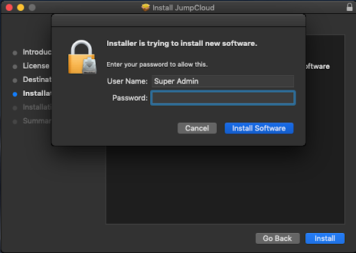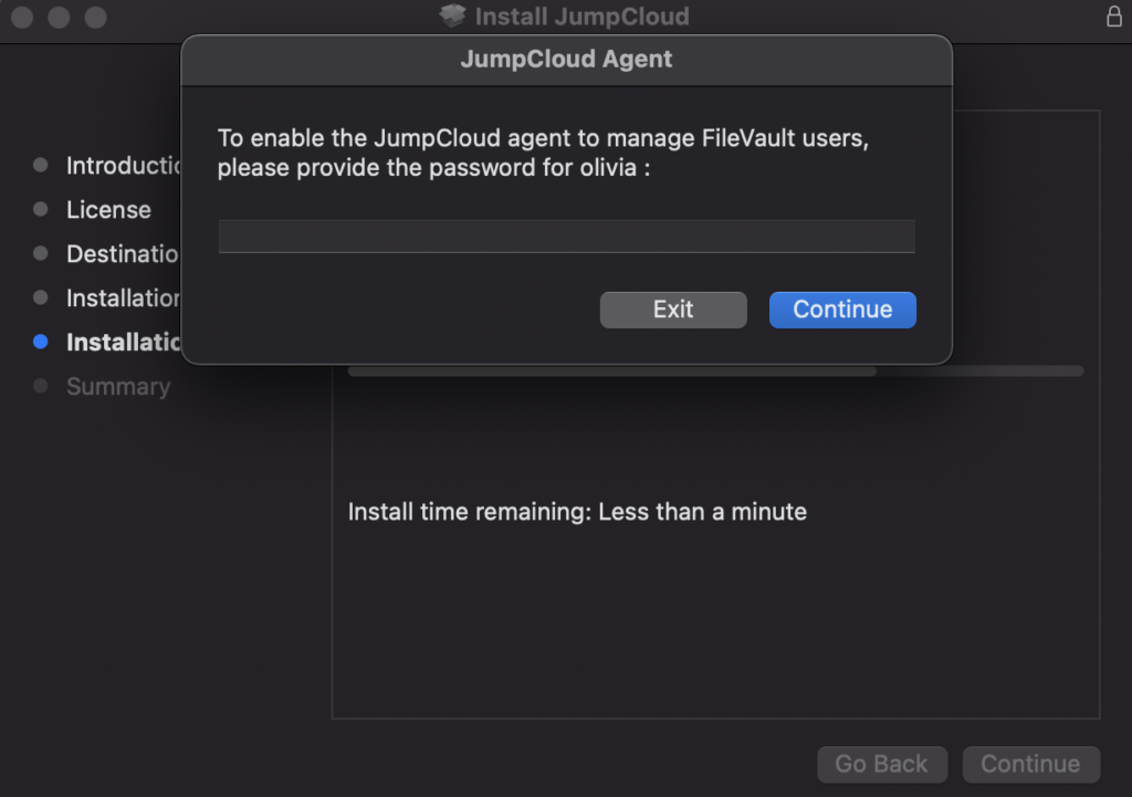 - On the JumpCloud Agent dialog, enter the administrator account password, then click Continue.