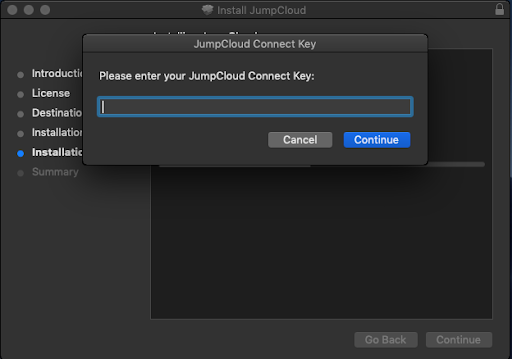 - Paste the JumpCloud Device Connect Key that you copied when you downloaded the agent, then click Continue.