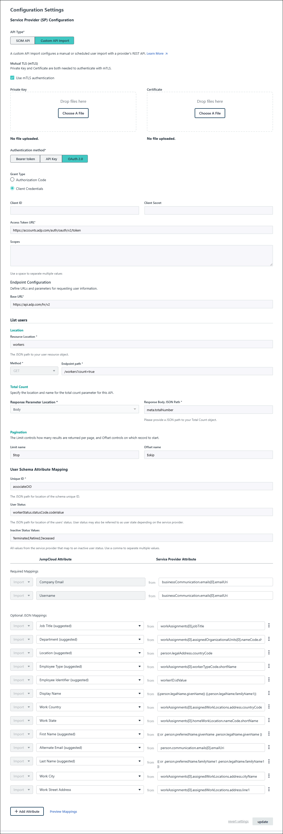 - There are several settings available for importing users from your custom application to JumpCloud.