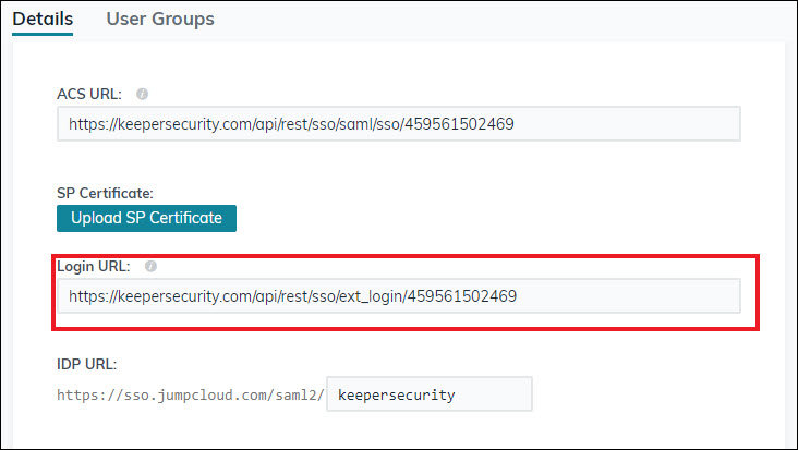 - For Login URL, enter https://keepersecurity.com/api/rest/sso/ext_login/<YourSSOIdHere>. You can find your SSO ID at the end of your SP Entity ID: https://keepersecurity.com/api/rest/sso/saml/459561502469