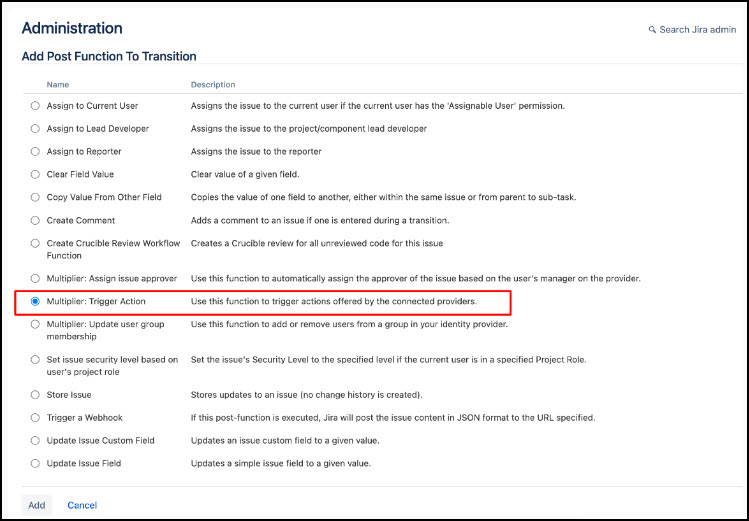 - Select the Issue, create a transition, and add the Multiplier Trigger Action post function.
