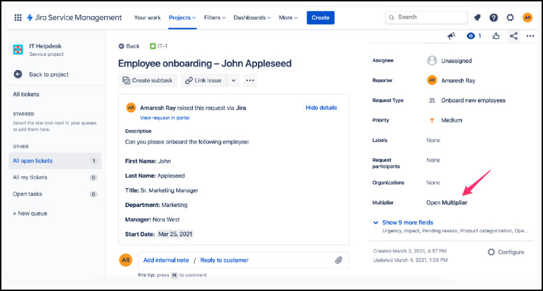 To trigger actions in JumpCloud, navigate to an issue and click on the Open Multiplier link in the sidebar.
