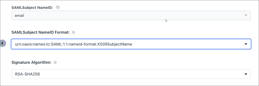 - By default, the SAMLSubject’s NameID is email, but can be changed to username, firstname, lastname, or description. However, it is recommended to change this value only if the SP requires a NameID other than email. Refer to the support article about SSO using custom SAML Application connectors for more details.