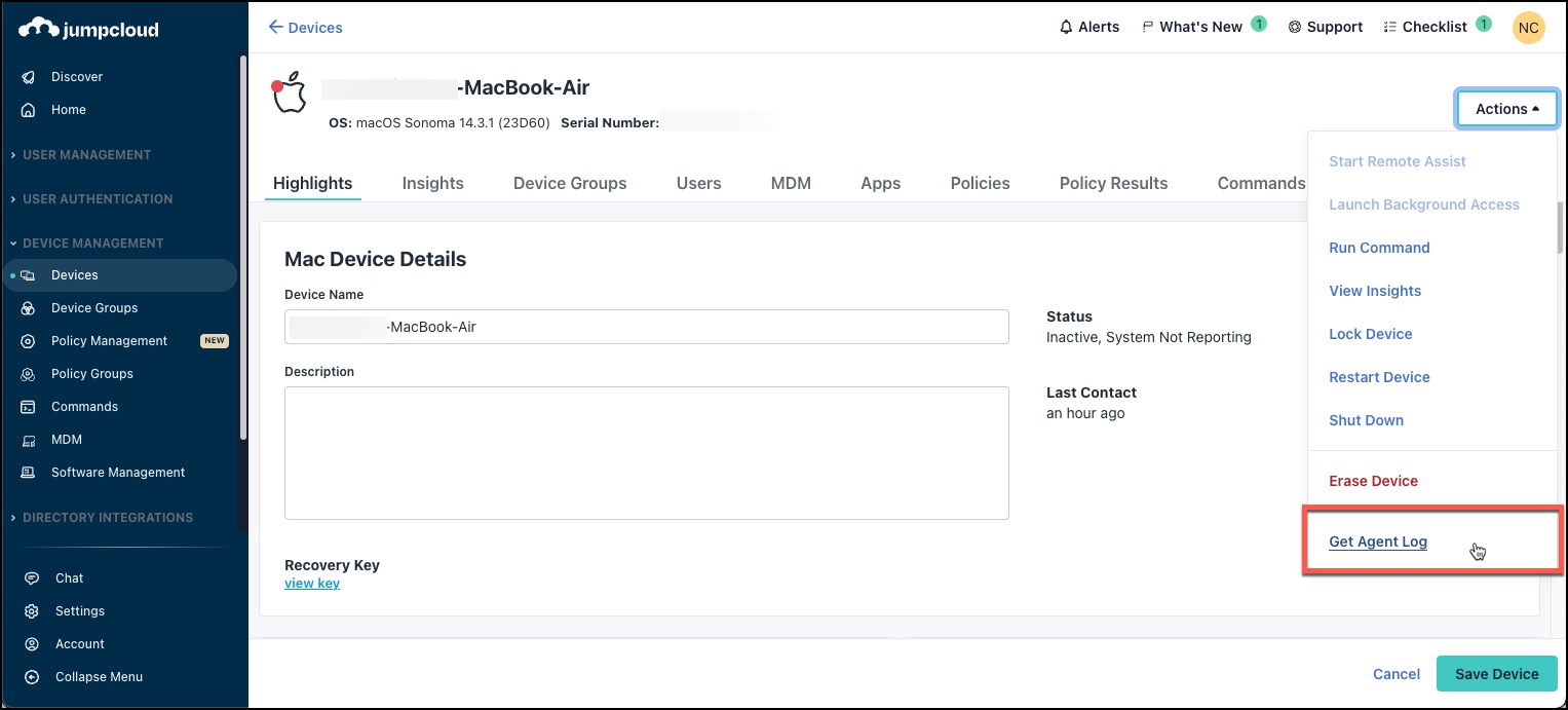 - Click the Actions > Get Agent Log to download the jcagent.log to your device.