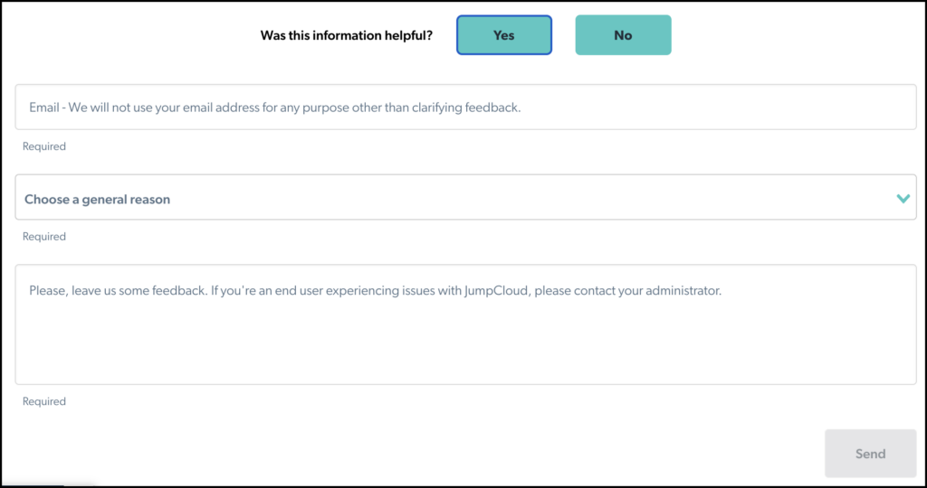 Public Previews are available for all JumpCloud users. Features in Public Preview are almost ready for general availability, but are taking a final opportunity to gather feedback from a larger audience. You will automatically have access to the feature in your Admin Portal, and can provide feedback directly at the bottom of the Help Center Article that supports the feature.