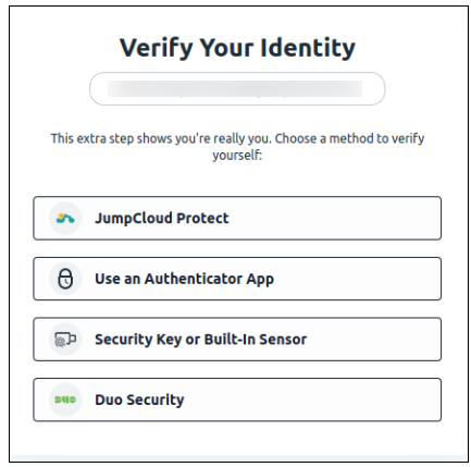 If your IT admin has required you to use an authenticator app, you’ll log in to the User Portal and SSO applications with it. Make sure you set up an authenticator app first. JumpCloud recommends you use JumpCloud Protect, which can also be set up to conveniently log you in with a push notification sent to your device.