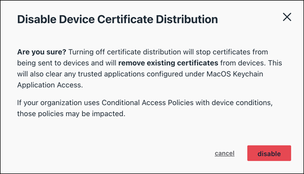You can remove global device certificates after you’ve distributed them. When you disable Global Device Certificates, existing policies aren’t updated, and any custom MacOS Keychain Application Access configurations are removed. To make sure users have uninterrupted access to their resources, disable policies with a device condition before you remove global device certificates. Learn how to disable a policy in Configure a Conditional Access Policy.