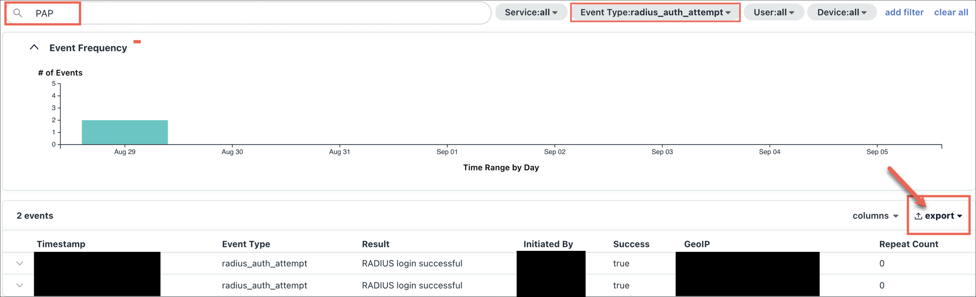 If your integration or equipment only supports insecure, non-TLS-based legacy protocols, use Directory Insights to try and mitigate your risk by monitoring RADIUS access and enforcing the following security measures for all users: