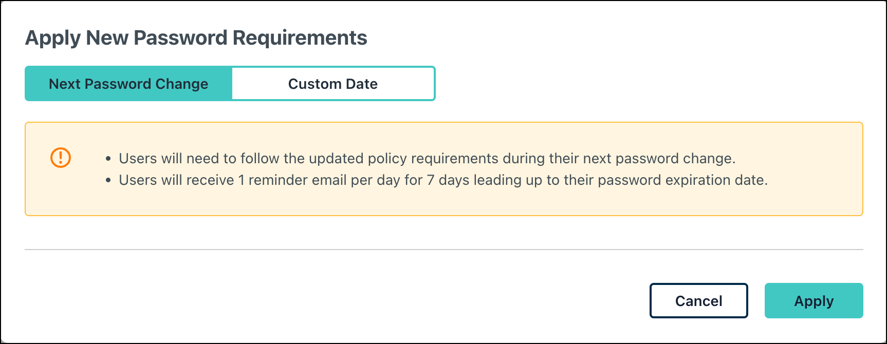 - Users will need to comply with the selected requirements on their next password change. Click Apply to confirm.