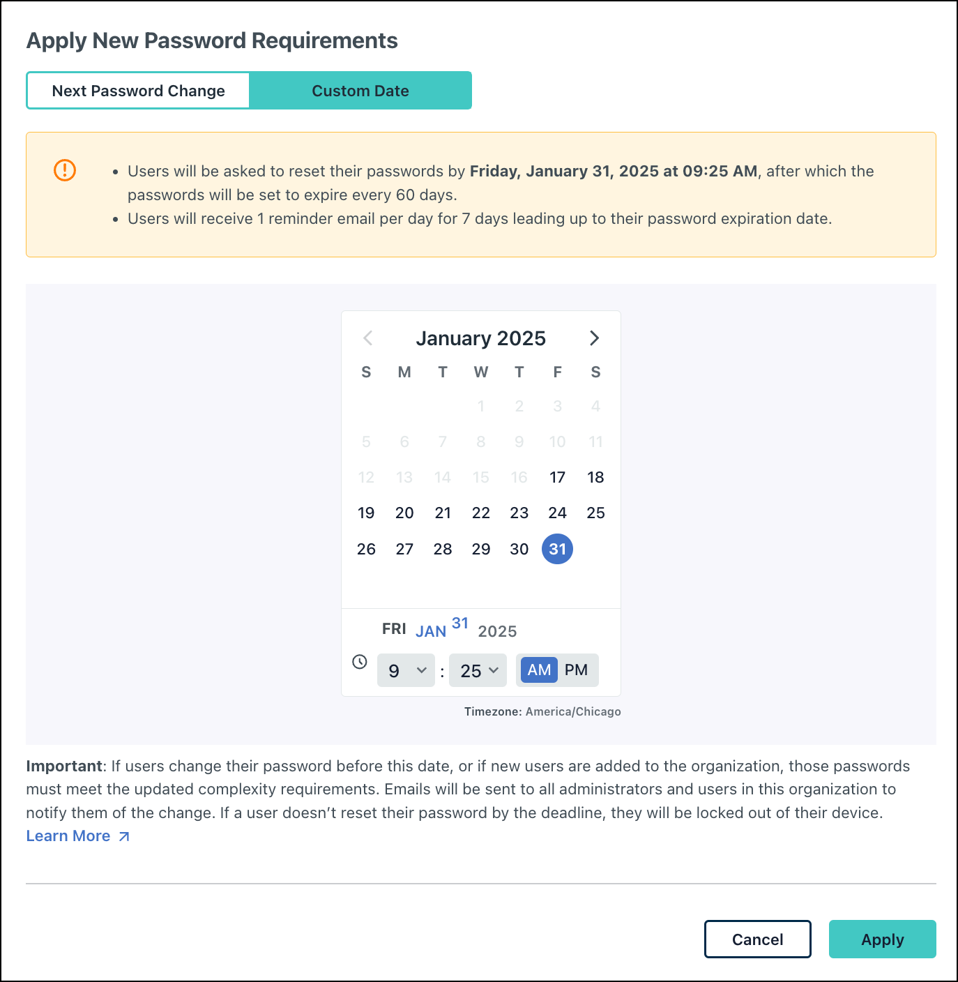 - If you prefer to set a custom date by which your users must update their password, click Custom Date and select the target date from the calendar.