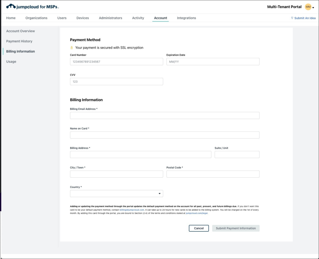 - When you add or update your MTP payment method, your account's default payment method for all past, present, and future billings is updated to the card you add. If you don't want the card you add to be your default payment method, contact billing@jc-proxy.apps.a-demo.org.