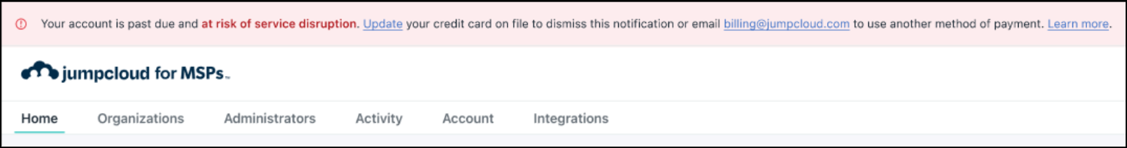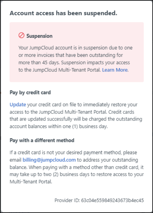 An account access suspension modal stating "your JumpCloud account is in suspension due to one or more invoices that have been outstanding for more than 45 days. Suspension impacts your access to the JumpCloud Multi-Tenant Portal. You'll have the option to resolve your outstanding balance. When the account is suspended, you won’t be able to navigate or make changes in the MTP, other than to update your credit card information. Access to your account will be restored once payment is received.