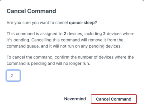 - A Cancel Command modal appears. To confirm the cancellation, enter the number of devices where the command is currently pending.