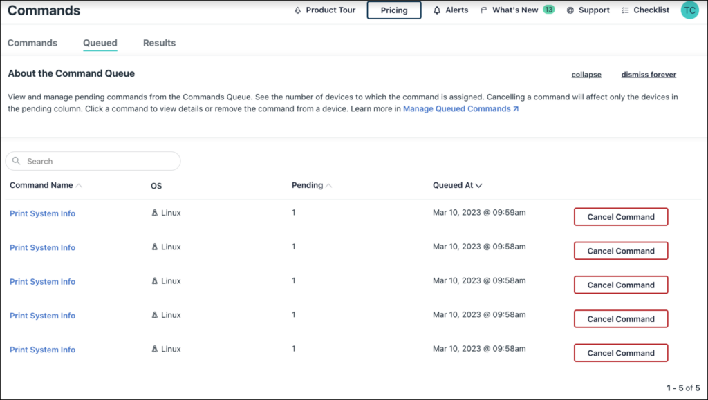 From the queued commands list, IT Admins can cancel commands in the queue or view command details to remove pending devices from queued commands. Use the search to find commands by command name. Note: Search is case sensitive and partial word search works only from the beginning of a word.