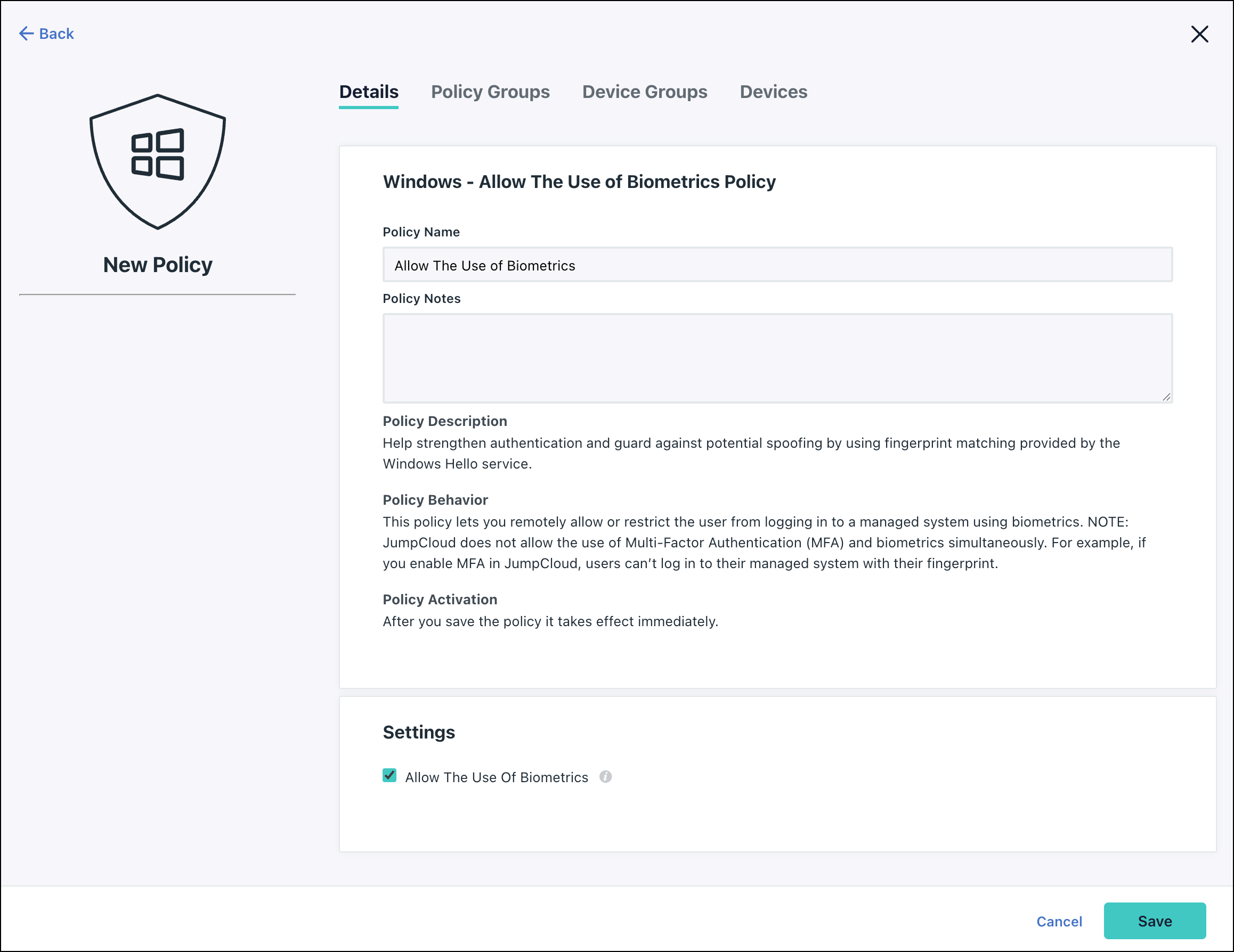 Windows provides a biometric authentication service called Windows Hello that helps strengthen authentication and guard against potential spoofing through fingerprint matching and facial recognition. JumpCloud's policy framework lets you remotely allow or restrict users from logging in to a managed device using biometrics. You can apply the policy to one managed Windows device or the entire fleet in your organization. See Get Started: Policies.