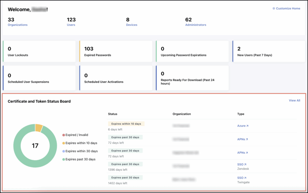 - Click on any of the five org names listed in the board to take you directly to the Admin Portal for that org so you can address the expired/expiring status.