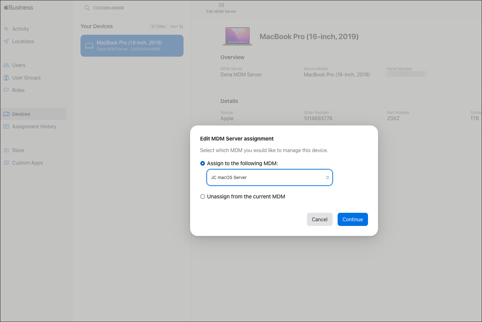 - Click Continue, then click Continue again to confirm the change. For more details on assigning and reassigning devices, see Apple's documentation on assigning, reassigning, and unassigning devices in ABM.