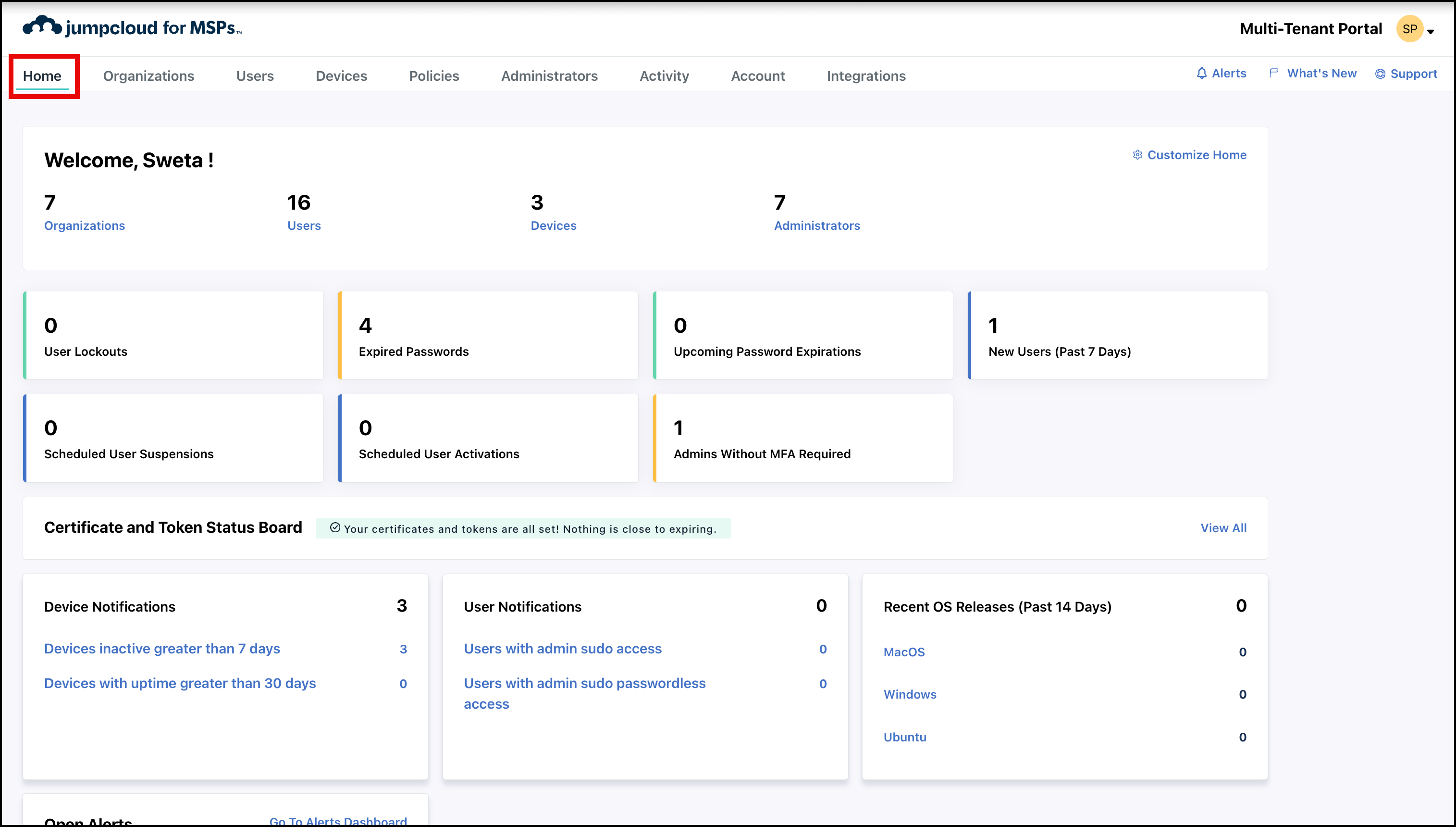 The Multi-Tenant Portal (MTP) Homepage gives you visibility into the status of organizations, users, devices, and more. You can customize your Homepage so that only the information that’s important to you is displayed. The Homepage widgets show you an aggregated view of statuses or any issues across all managed orgs. After you click a specific widget, it pulls up detailed information about any alerts, lockouts, and more for the affected orgs. Learn how to manage your Homepage widgets and resolve issues quicker.