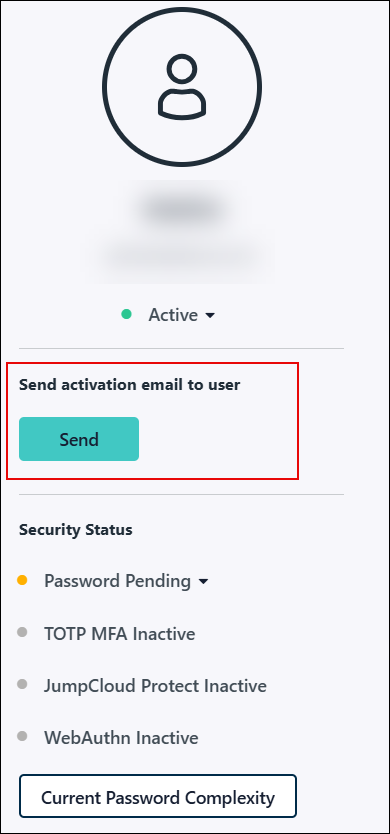 Users with a Password Status state of Password pending and User State of Active need to complete the activation process by following the instructions provided in the activation email sent by their admin. Alternatively, an admin can specify a password for the user in the Admin Portal. These users will have full access to their JumpCloud managed resources once their password is set and their account is in an Active user state. See Connect New Users to Resources to learn more.