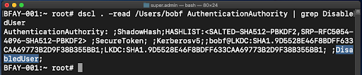 # dscl . -read /Users/USERNAME AuthenticationAuthority | grep DisabledUser