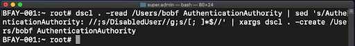 To read macOS's AuthenticationAuthority status for a user, you need to switch to root to properly re-enable the user.