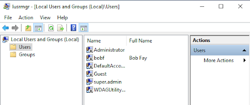 - In the start bar, or via Run, enter lusrmgr.msc. The Local Users & Groups Manager tool opens in Windows.