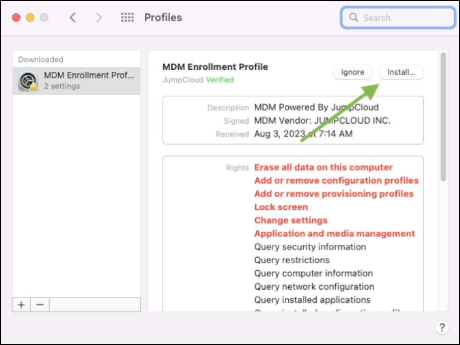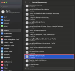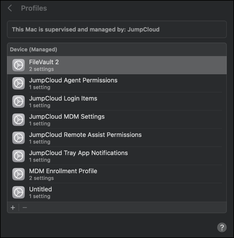 - After approving the MDM Enrollment Profile, the device will be re-enrolled in JumpCloud MDM and receive all of the profiles associated with, it including the JumpCloud default profiles for the Agent, Remote Assist, Tray App, and MDM.