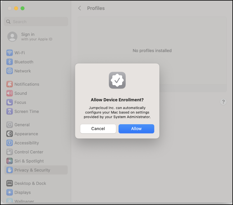 - To allow JumpCloud to automatically enroll your device, on your Mac device go to System Preferences > Privacy & Security, and click Allow.