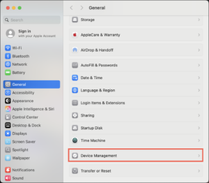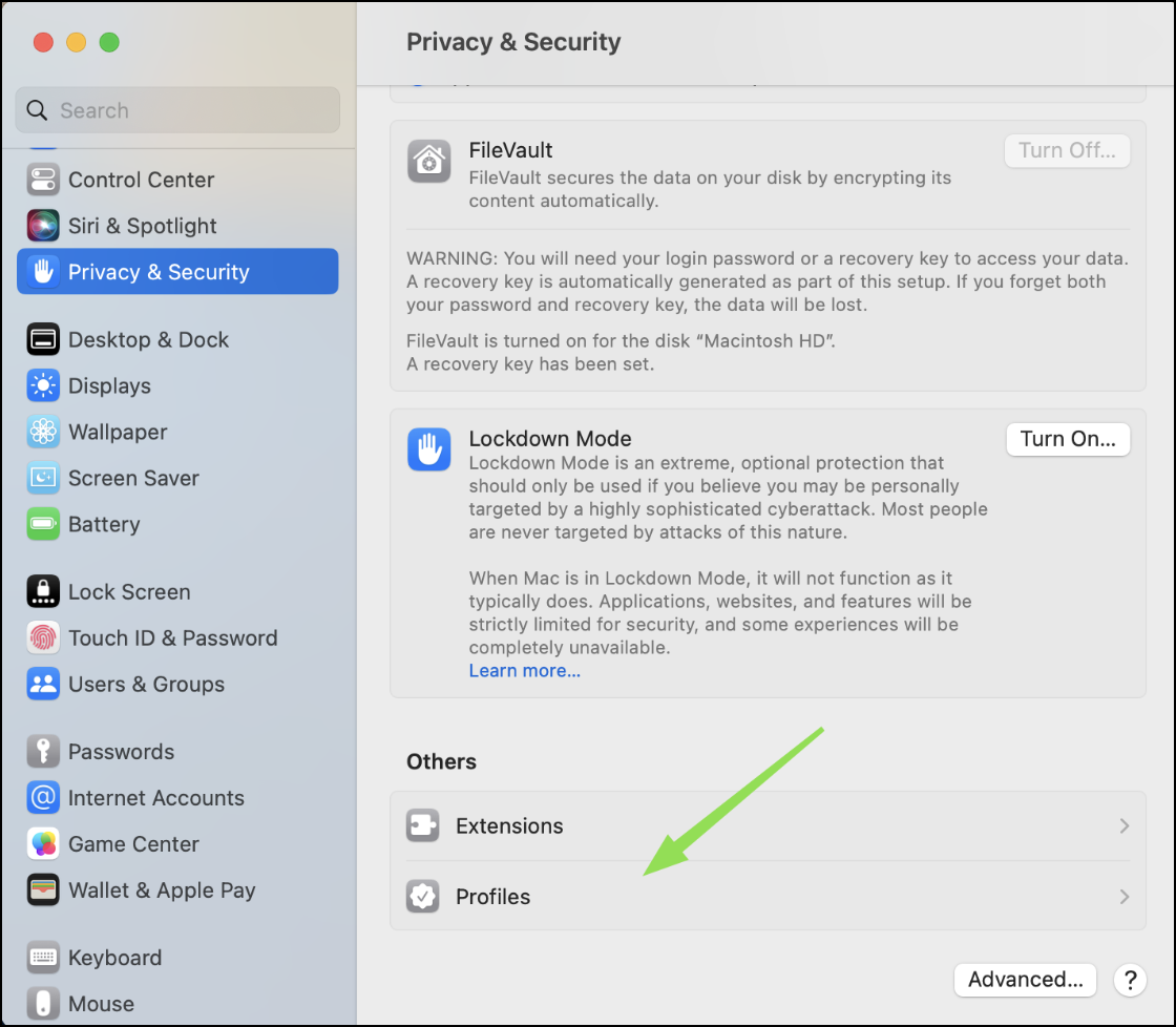 - For macOS versions 13 and later, browse to System Settings > Privacy & Security > Profiles.