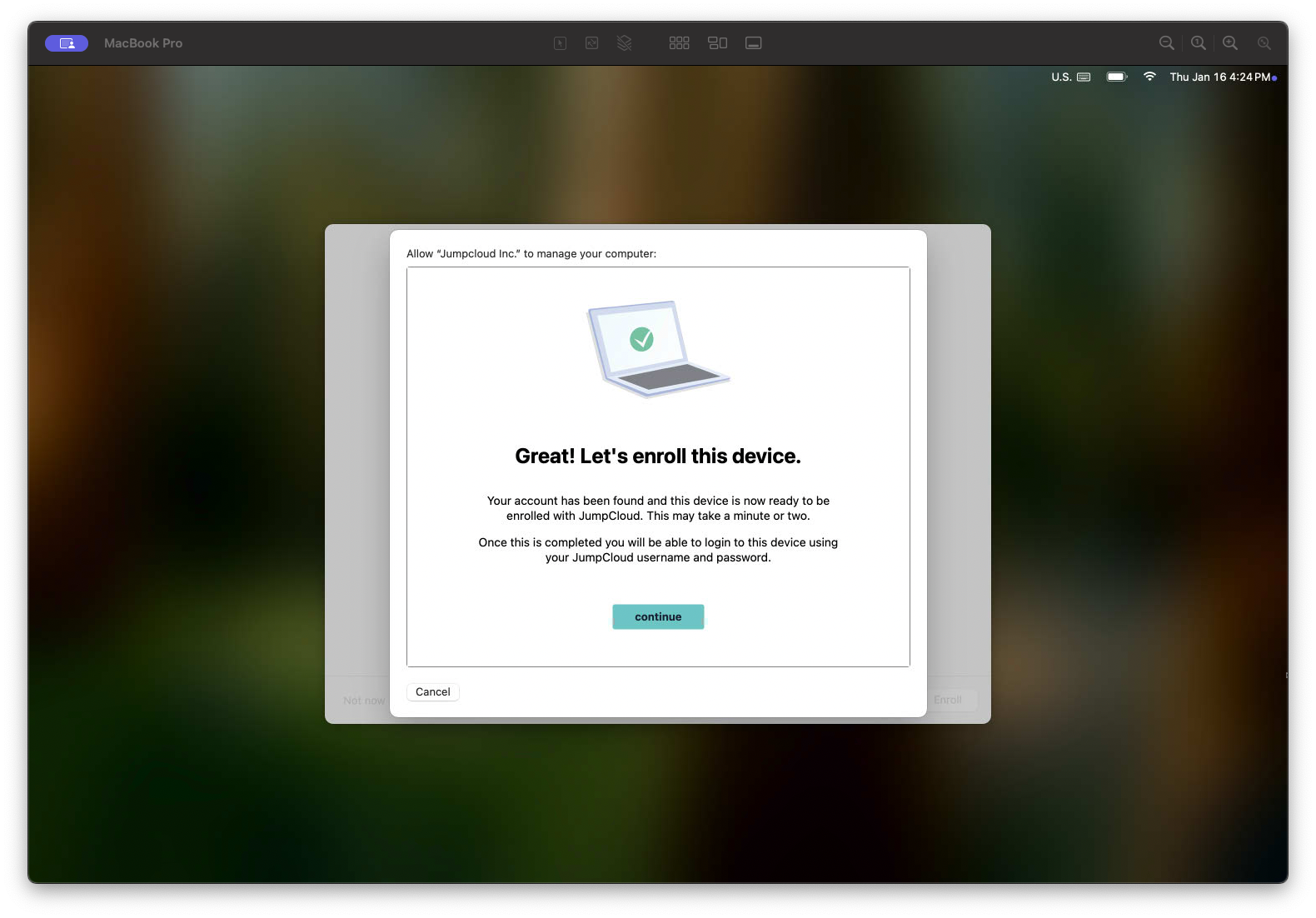 - A message displays asking to confirm JumpCloud's management of your device. Click Enroll.