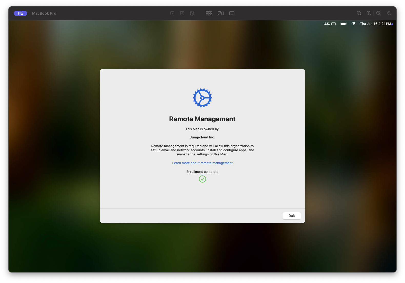 - When the enrollment profile has finished installing, you will see an enrollment complete message. The device is now managed by JumpCloud. Click Quit to begin using your device.