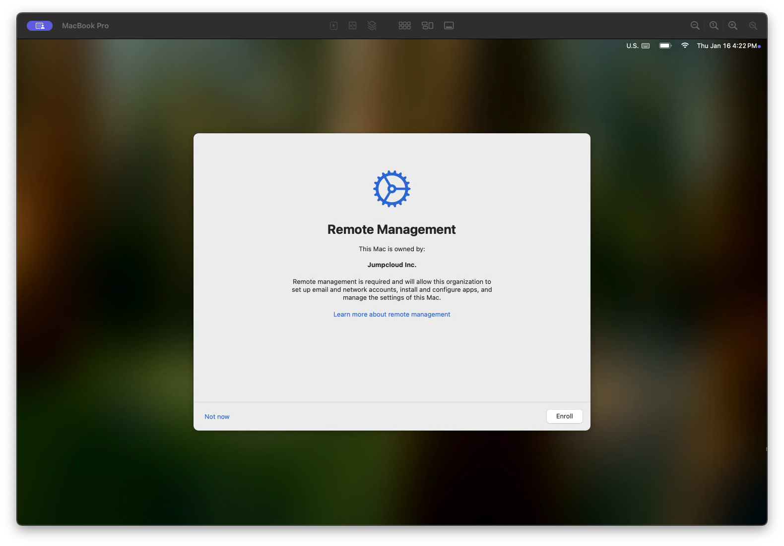 - A Remote Management screen appears displays asking to confirm JumpCloud's management of your device. Click Enroll.