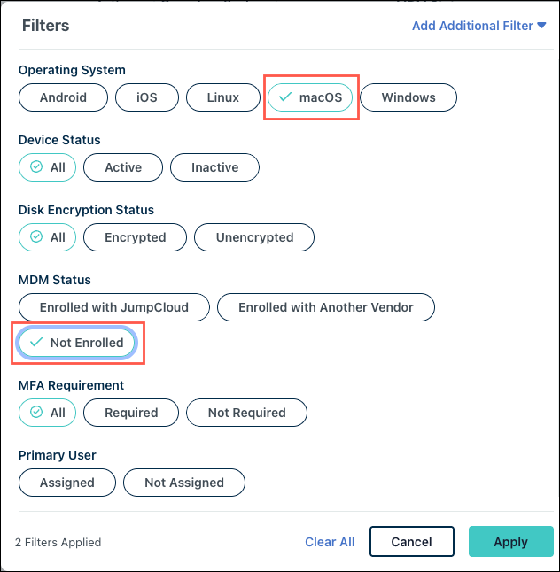 - To identify macOS devices that are not enrolled in JumpCloud MDM, click Filters and select the following: