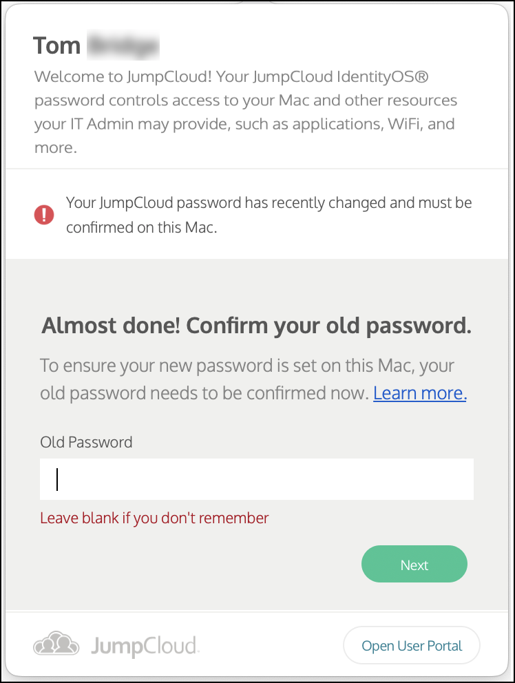 After the user clicks Next, the local login password is changed to the JumpCloud IdentityOS password and the keychain is reconciled.