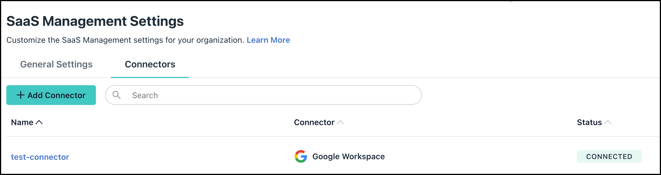 - Under AI & SaaS Management Settings, click the Connectors tab, then click + Add Connector.