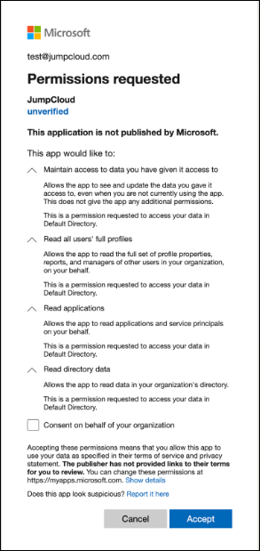 - Read directory data: Allows JumCloud to list OAuth permissions in your directory.