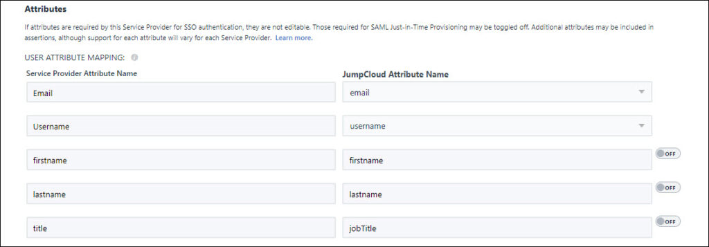 - Toggle off the attributes if you’d like to opt out of sending the attributes in the SAML assertion. Learn more about SAML.