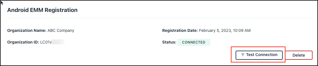 - Scroll down to Android EMM Registration and click Test Connection and ensure the registration Status is Connected.