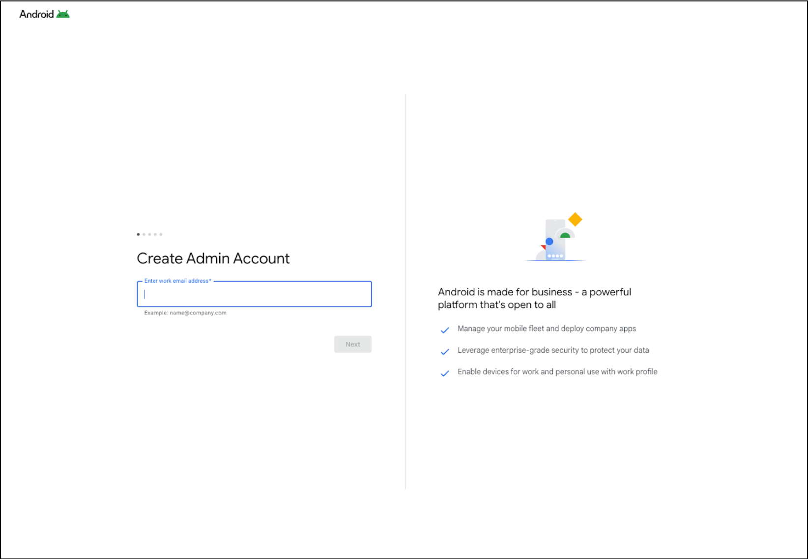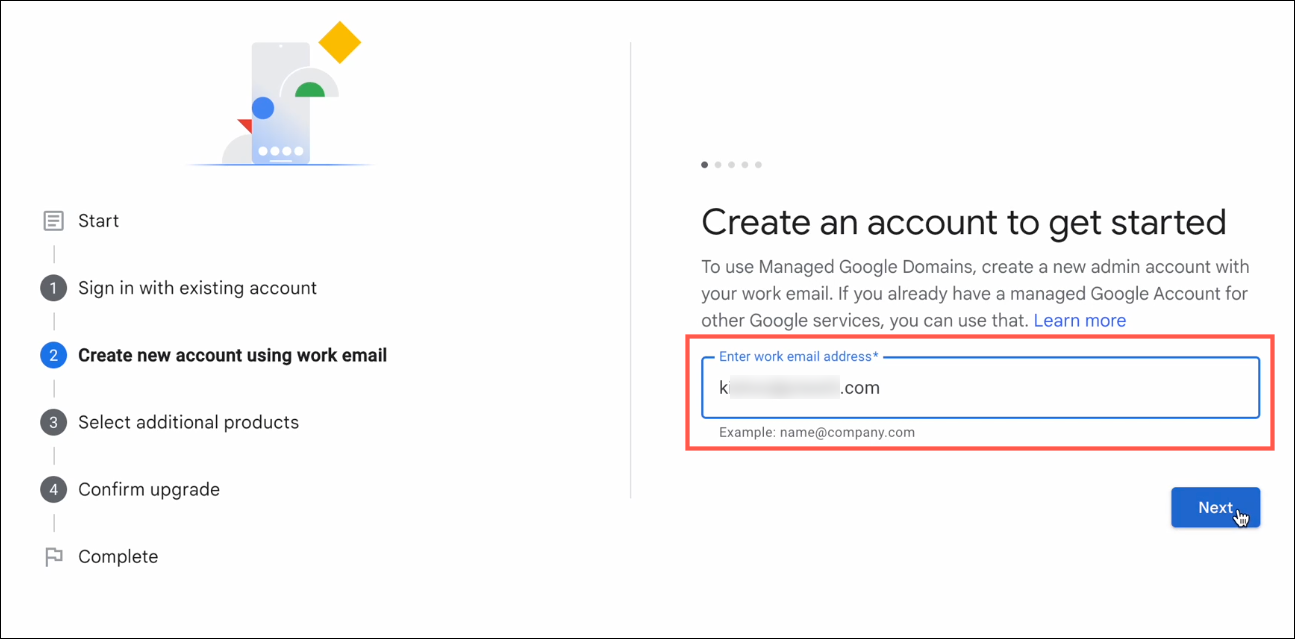 - Under Create an account to get started, enter your work email address. You can enter your existing Enterprise Google Admin account if you have one already. Click Next.