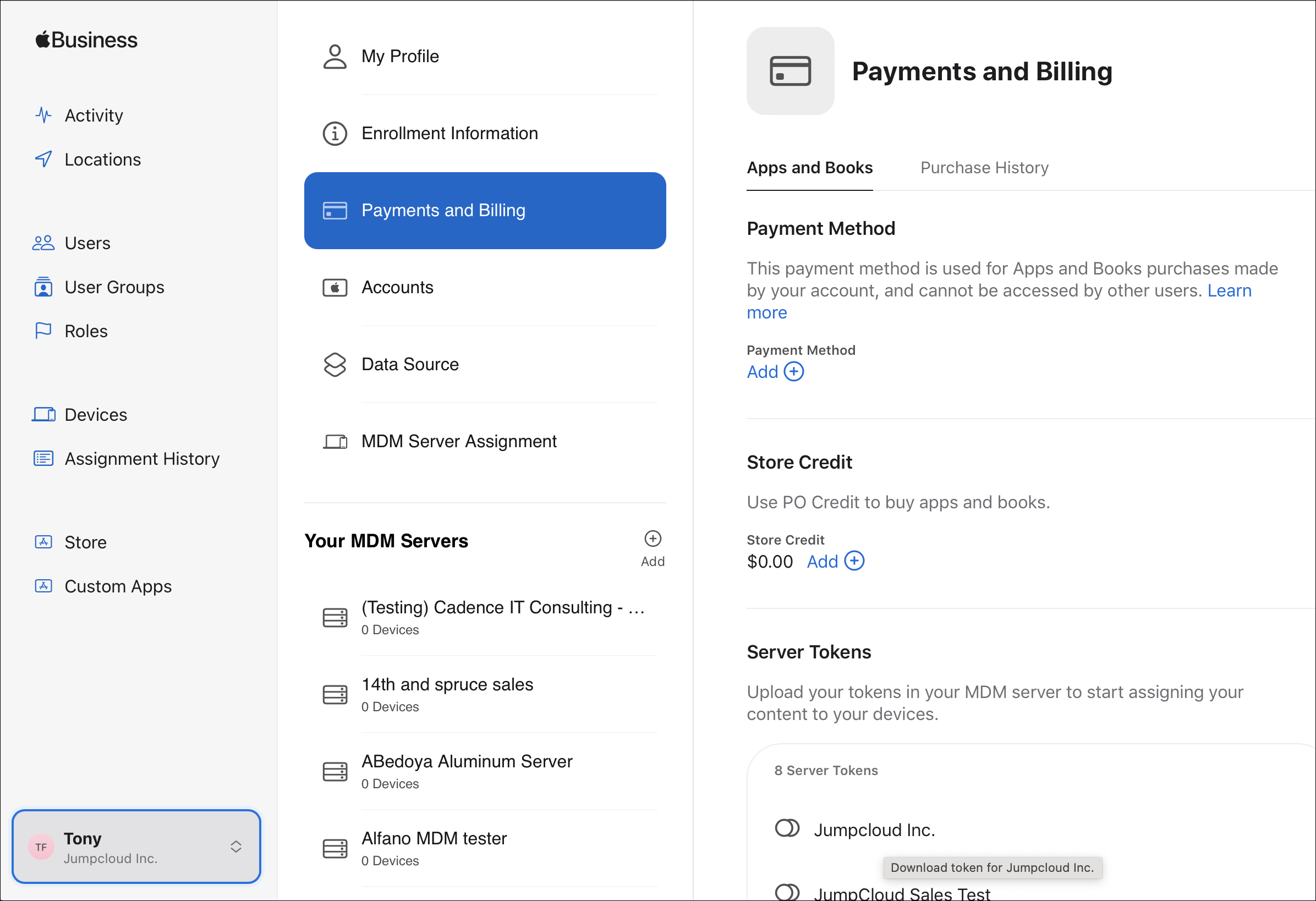 - Set up VPP by connecting your organization to Apple’s VPP by uploading a location's VPP token to JumpCloud. This requires you to download a token from ABM or ASM and upload the token to JumpCloud.