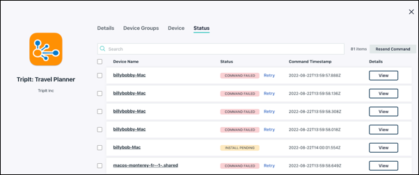 - A command will fail if the app is already installed on the end user's device (status code 12025). When the user has uninstalled the application from their device, you will see the retry option from the command results.