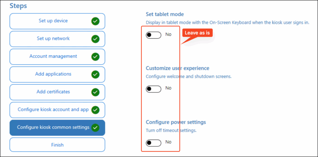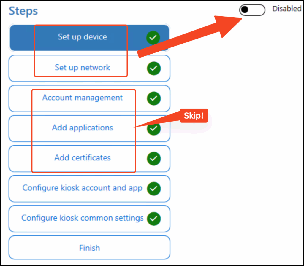 - Configure the Kiosk account. Skip the sections as shown in the image below: