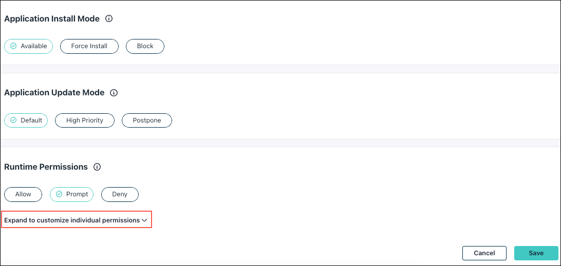 - Under Runtime Permissions, choose a response for specific permissions for any work app:
