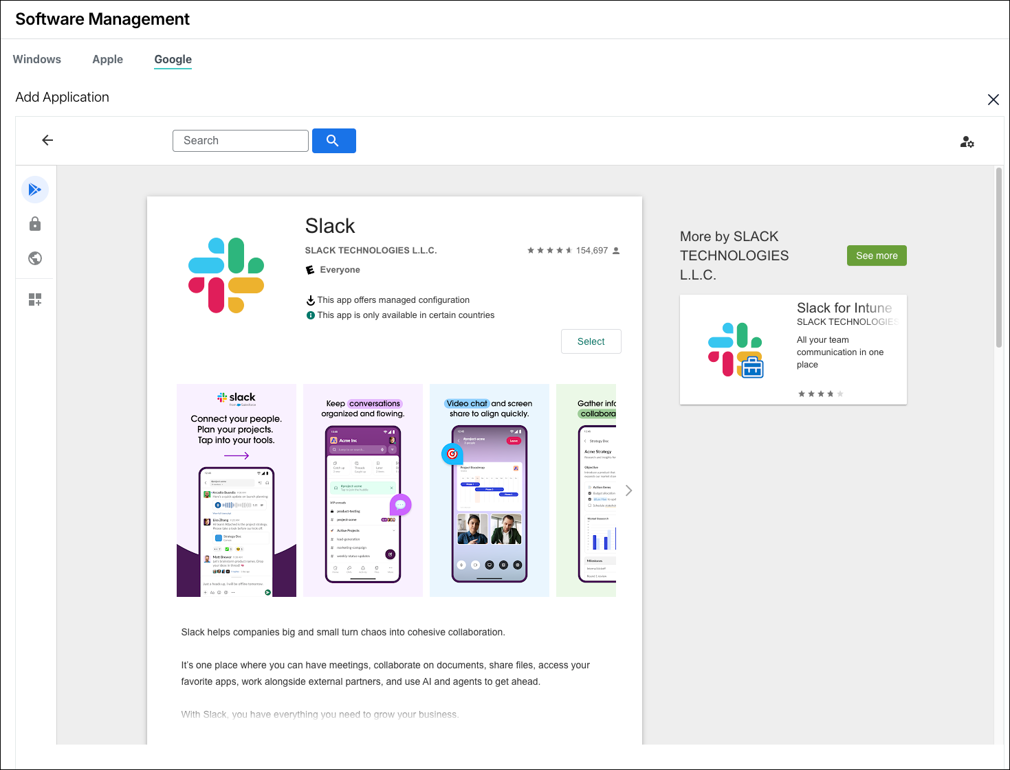 - From the managed Google Play Store, locate and select the app you want to add, then click Select. You can also search for an app title and view details about the app before you select it.