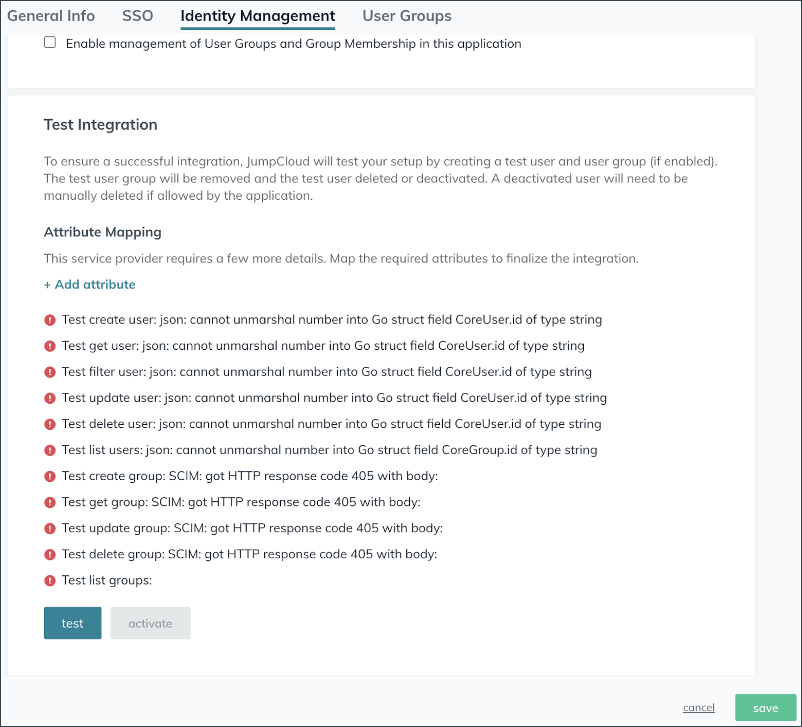 This typically indicates that JumpCloud is expecting one data type and the service provider is sending another data type. Contact the service provider to troubleshoot further. JumpCloud implementation follows the SCIM schema standard. Per section 2.2, if the data type is not specifically stated, we use the data type of "string."